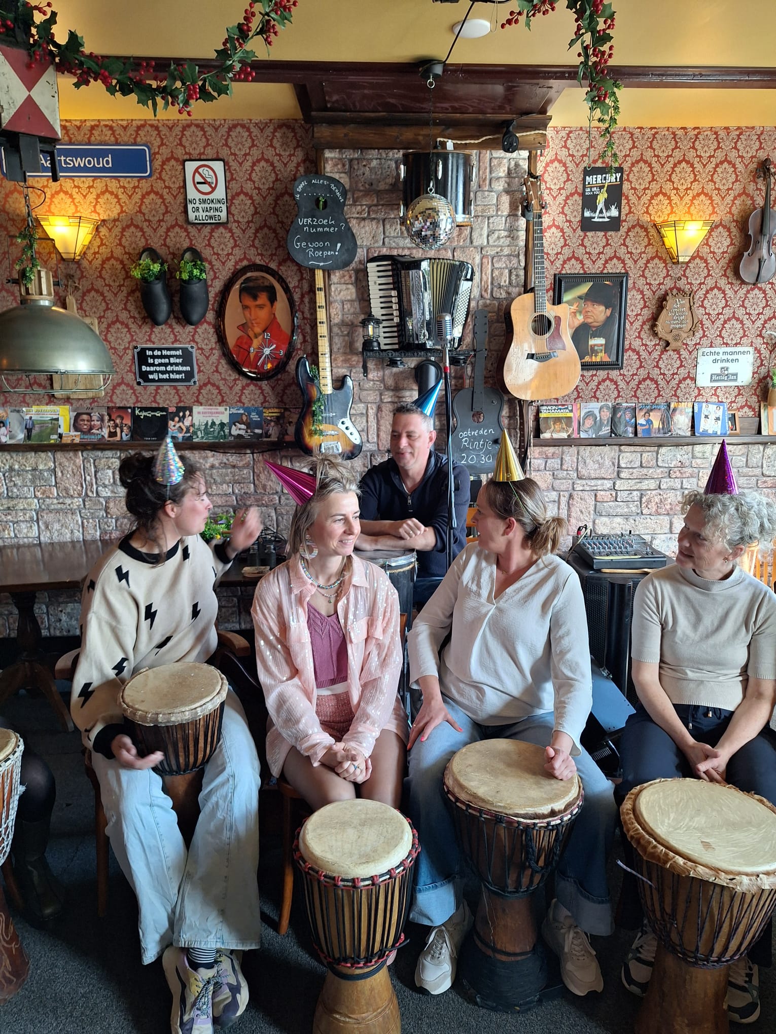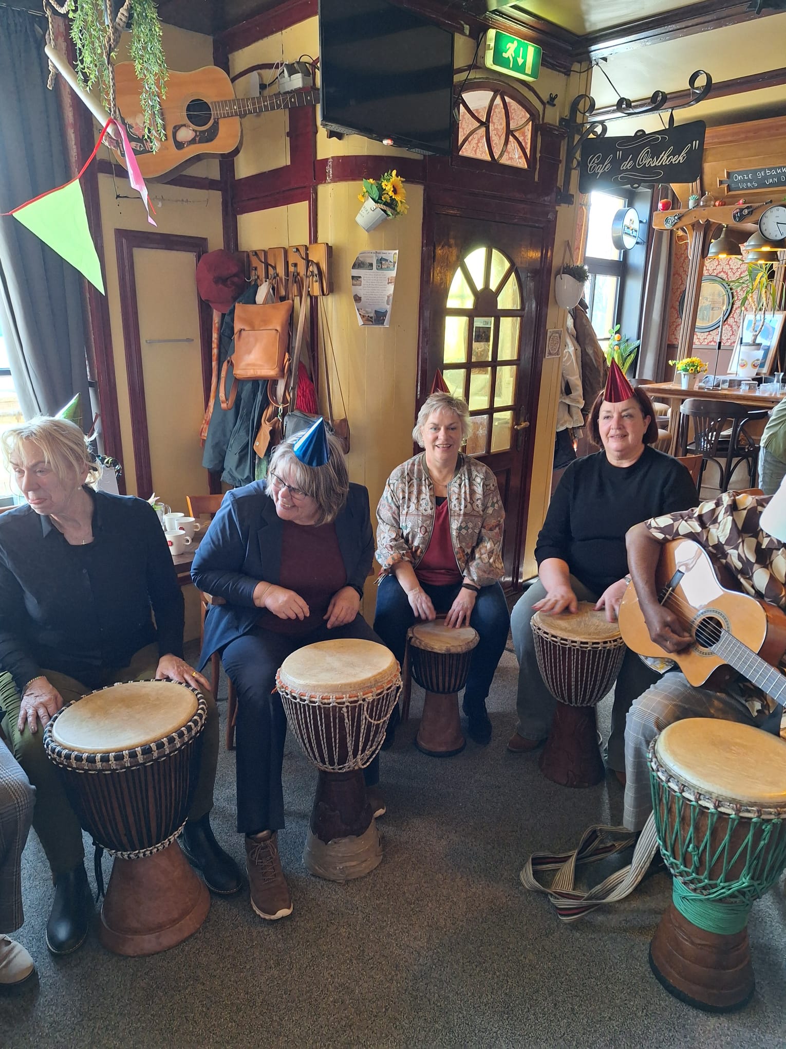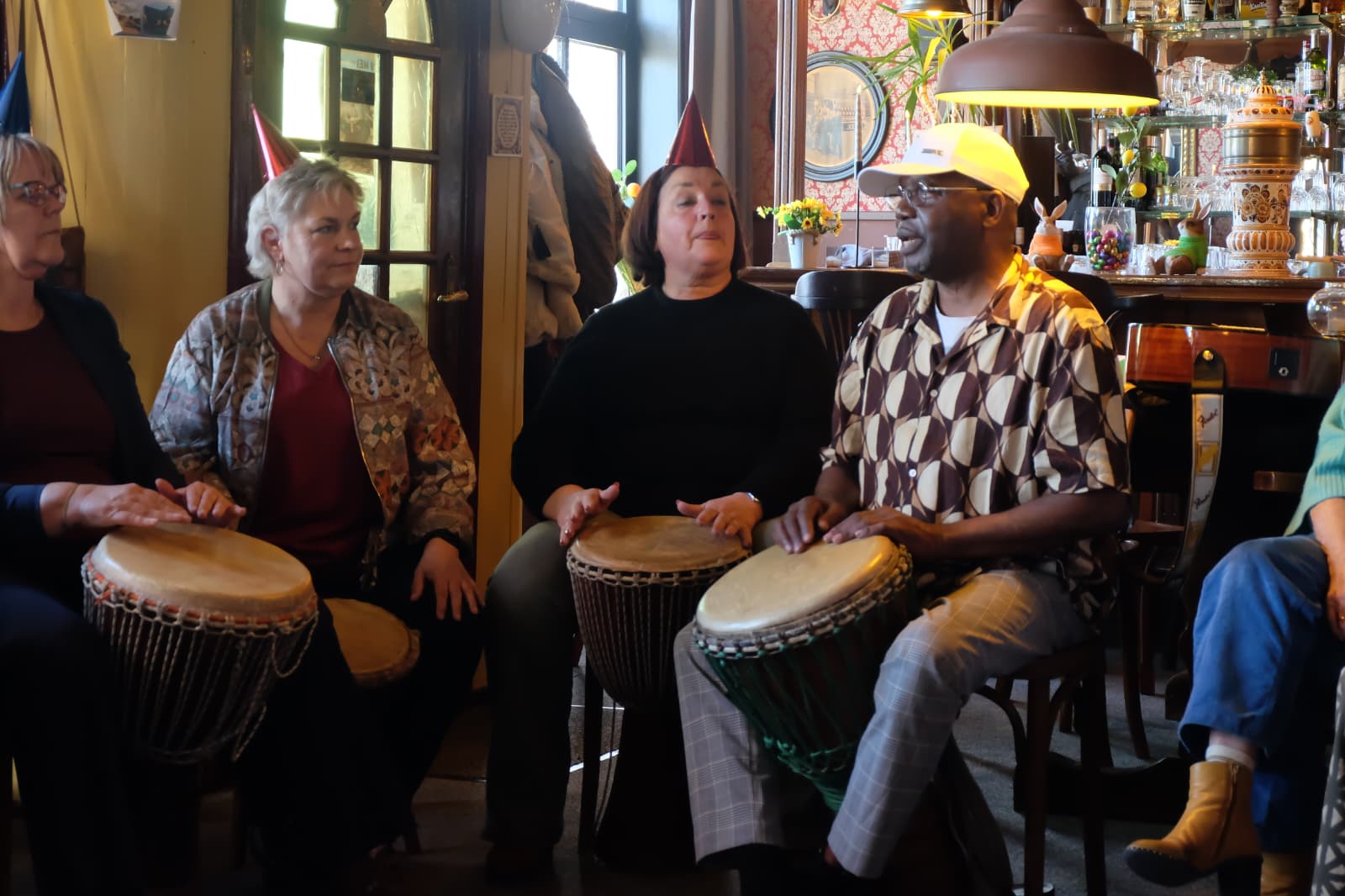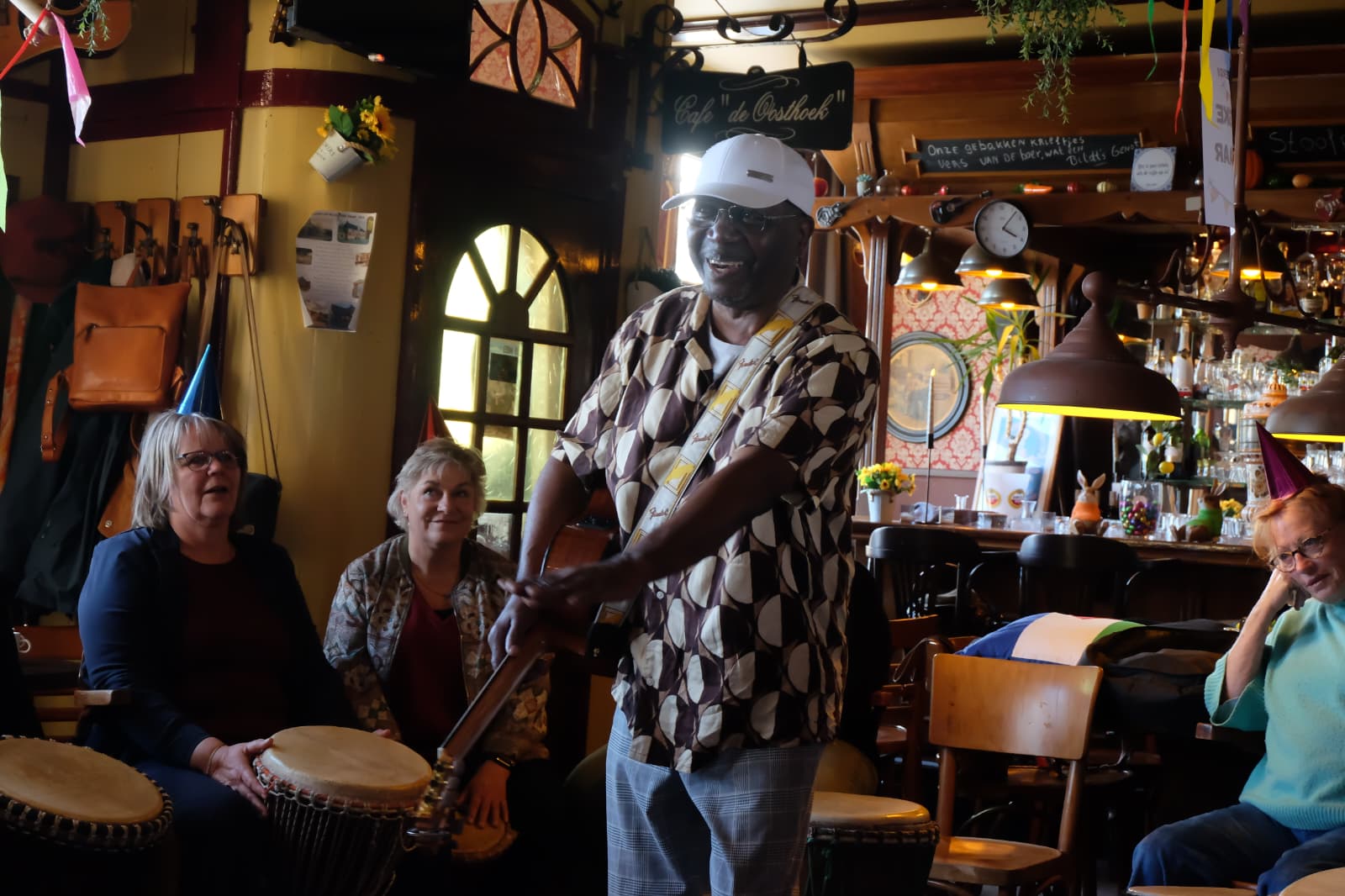 Er werd gestart met een overheerlijk stuk oranjekoek van bakkerij Friso te Bitgummole waarna we een heuse Djembee sessie volgden onder leiding van Basile Maneka wat een feestje. Na een overheerlijke maaltijd, hoe doen ze het daar, hebben we heerlijk gezongen voor een ander gezelschap dat ook in het kafee iets te vieren had. Wat een geweldige dag hebben we met elkaar gehad.