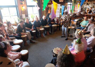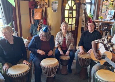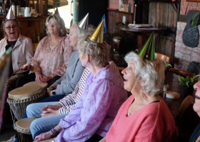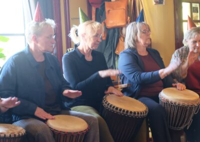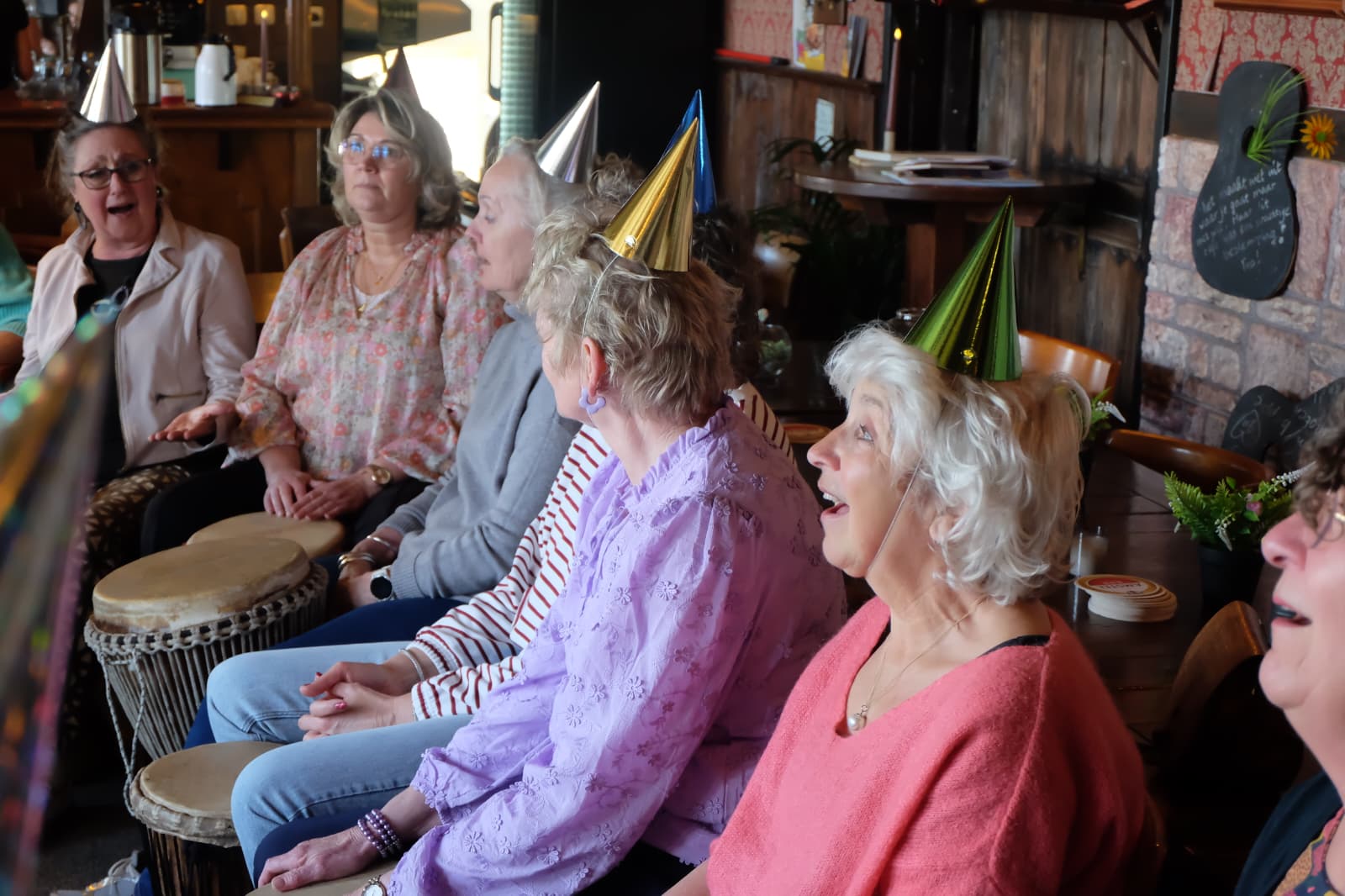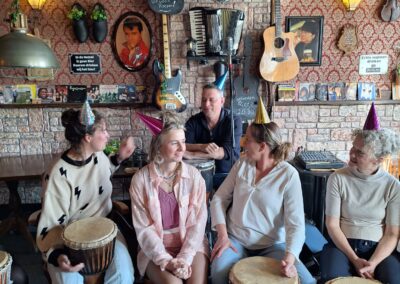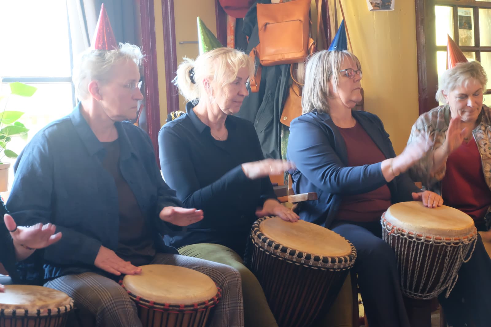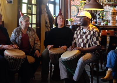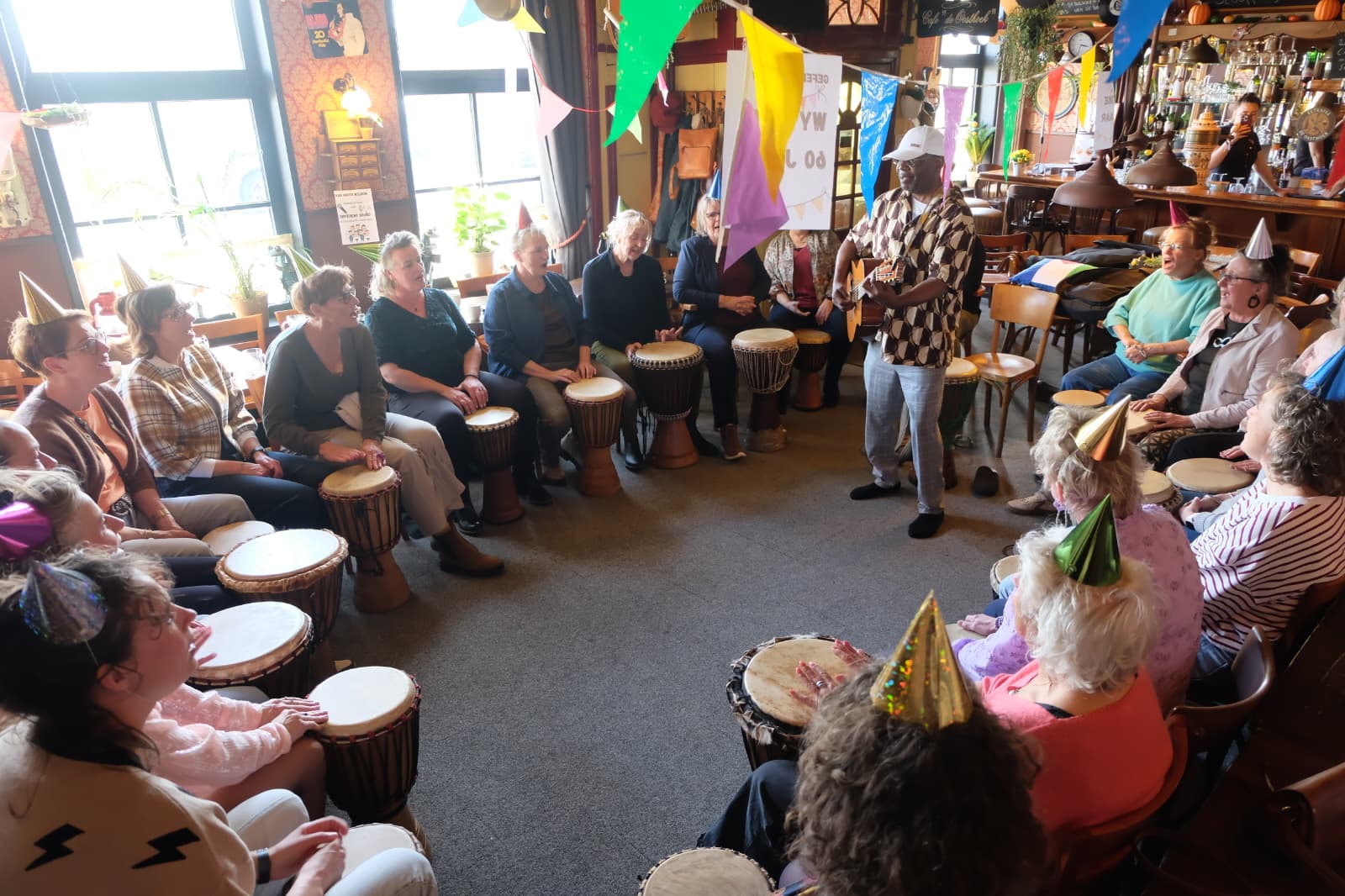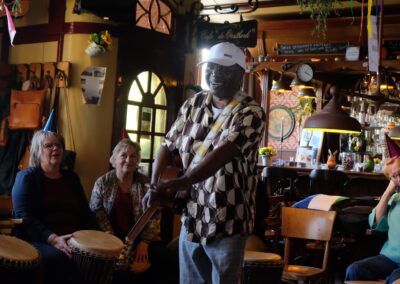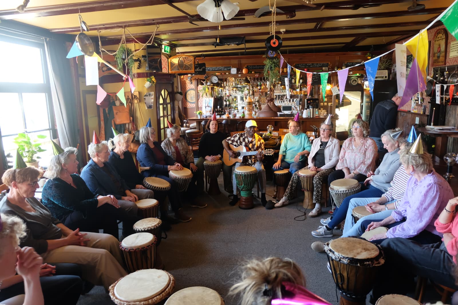Er werd gestart met een overheerlijk stuk oranjekoek van bakkerij Friso te Bitgummole waarna we een heuse Djembee sessie volgden onder leiding van Basile Maneka wat een feestje. Na een overheerlijke maaltijd, hoe doen ze het daar, hebben we heerlijk gezongen voor een ander gezelschap dat ook in het kafee iets te vieren had. Wat een geweldige dag hebben we met elkaar gehad.